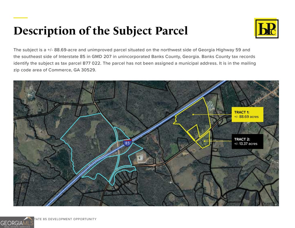 Interstate Development Opportunity. Zoned ARR in Banks County, with future potential for Commercial or Residential development. Ownership is open to sale or ground lease opportunities. Ownership is open to a substantial due diligence period in order to accommodate entitlements. Location Highlights -- Located one exit north of the Tanger Outlet mall interchange. Well positioned just north of the interchange exit. Frontage along Interstate 85 and access frontage on Highway 59 Additional 13.37 acres (listing no. 10257605) across Highway 59 available. See www.i85land.com for additional info. or to view other tracts in the vicinity.