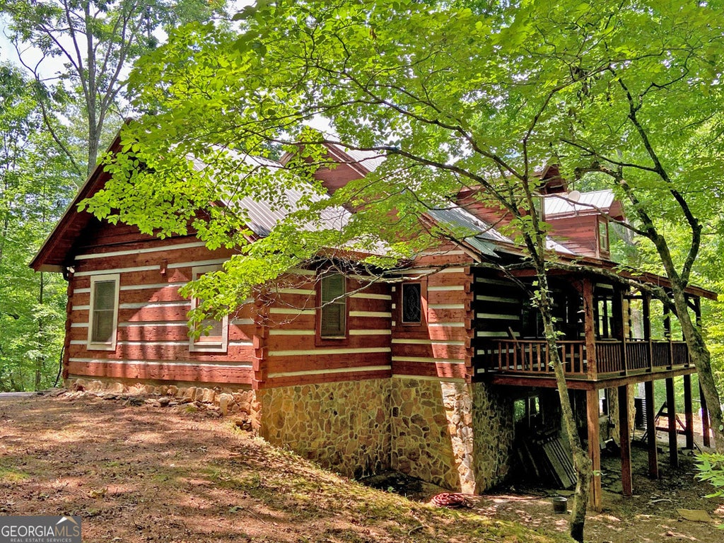 HIGH UP ON THE MOUNTAIN in a most peaceful and naturalized setting is where you'll find this three-bedroom, two-and-a-half bath authentic log home on 7.1 acres. BRAND NEW APPLIANCES - a stainless steel - stove, vent hood, dishwasher, and refrigerator have just been installed and a punch list of repair items for the home has been completed. Come in from the covered porch and discover exposed wood beams, complementing wallcoverings, native-stone fireplace, wood plank floors, and stone tile across the kitchen and dining area to complete the mountain-appropriate theme. There's plenty of room in the kitchen which is open to the dining and great room area along with a generous pantry to store your goods. A laundry room is adjacent and a half bath is in the hallway. The great room centers on the fireplace and a lengthy covered back porch overlooks a beautiful and wooded setting where all you'll hear are the sounds of nature. Bookending the home and off the great room is a sprawling and covered deck with a view - you'll love spending time here! The master suite resides on the main level and upstairs are two bedrooms along with a full bath, each with a spacious bonus room and lots of closet and storage. There are two HVAC systems for the home and one is only a few months old. Below is a full basement with a garage door entry along with interior and outside doorways. A paved roadway pulls you up to the home's entry and access is convenient to Cleveland and Dahlonega. Blairsville is across the mountain. This location is central to all the amenities and activities of the North Georgia Mountains so you'll never lack for things to do. Make it your mountain retreat, you'll enjoy it for weekends or for life.
