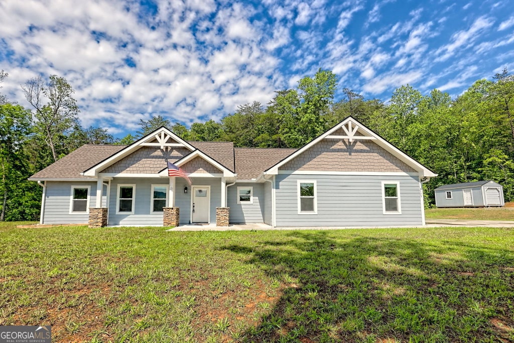 Welcome to your dream home! Like-new RANCH 3-bedroom, 2-bath boasts a thoughtfully designed split bedroom floor plan, offering both privacy and the comfort of one-level living. As you enter, you're greeted by a charming front porch that invites you to relax and take in the quiet surroundings. Step inside to find a modern kitchen featuring stunning quartz countertops, elegant gray shaker-style cabinetry and stainless-steel appliances. The open layout seamlessly connects to the cozy fireside family room, making it perfect for entertaining. The expansive primary suite is a true retreat, complete with an en-suite bathroom showcasing a seamless glass shower accented by designer tile, dual vanity, and spacious dual closets. Additional two secondary bedrooms share a full bath. Ample storage in the two-car garage and an outbuilding for your lawn equipment or future workshop. Nestled on a .75-acre level lot, you'll enjoy breathtaking mountain views from the front porch, while the private covered patio provides a quiet setting in your secluded backyard. With no HOA and no restrictions, you have the freedom to make this beautiful property your own. Owner upgrades include renovated bathrooms, new countertops in kitchen, all new lighting, appliances and window treatments throughout, expanded concrete drive, power ready and insulated storage shed, stone landscaping and paving community road.