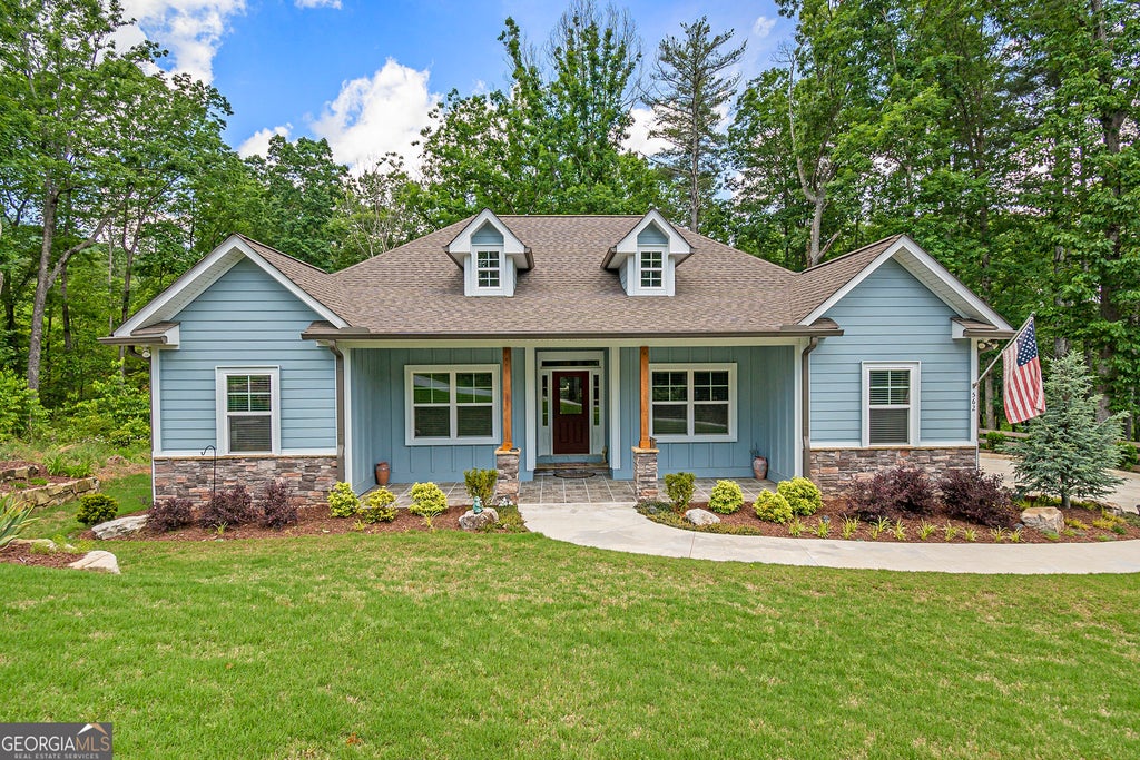 Charming craftsman bungalow in the historic Sautee Nacoochee community, located between Helen and Clarkesville, Georgia. This delightful 3-bedroom home boasts stone and board-and-batten details, a flat, beautifully landscaped yard, and mature trees along a paved street. Inside, enjoy high ceilings, a vaulted living room with a stone fireplace, and a split floor plan with luxury vinyl and carpet flooring. The spacious kitchen features a breakfast bar, flowing into a separate dining room, while the laundry room and attached garage adds convenience. The primary suite impresses with a custom closet system, shoe racks, and a luxurious bath with a shower, soaking tub, and double vanities. Upgraded six-panel doors add elegance throughout. Outside, relax on the covered deck or grilling porch, with extra tuck under storage for all your needs. To top off this fantastic Mountain home, a year round flowing creek marks the lower property boundary.