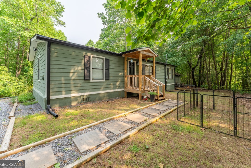 Secluded Mountain Home with Elijay Charm! 3 Bedroom, 2 Full Bathroom Mobile Home on a Permanent Foundation on a 1.66 Acre Lot with a Large/Level Driveway. Tastefully Updated with Current High-End Granite finishes, Backsplashes, and Stainless Steel Appliances in Kitchen. Painted Neutral Colors Throughout and Lightly Lived in. Located only Minutes from Downtown Elijay, this Property is situated on a Private Residential Street with only 4 Homeowners, No HOA! The 1.66 Acre Lot offers a Fenced Yard, Pasture, Small Animal Barn, and a Shed. Oversized Private Back Deck Overlooks Large Backyard and Provides Access to Back of Home. Newer Roof, Siding, AC and Furnace, Gravel Driveway, Plumbing, Electrical, and Doors; Fully Renovated with ~60 Acres of Untouched Land Behind Property!