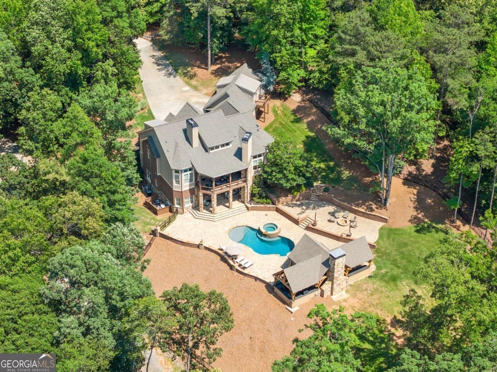 A rare Lake Lanier compound where refined living meets relaxed lake life - with two dock permits! Privately gated on nearly 16 wooded acres with over 350 feet of shoreline, this secluded estate offers an unparalleled blend of natural beauty and quiet luxury. The home spans over 5,000 square feet and balances rustic elegance with modern comfort. Soaring beamed ceilings, a two-story stone fireplace, custom built-ins, and walls of glass frame the surrounding landscape and flood the space with natural light. A gourmet kitchen anchors the main level with granite countertops, high-end appliances, an oversized island, and a walk-in pantry with wine storage. A custom "lake blue" vent hood and coordinating bar add subtle sophistication. The flexible breakfast nook is ideal for quiet mornings or creative work. The primary suite features double tray ceilings, two custom closets, and a spa-inspired bath with terrazzo finishes, a soaking tub, and a dual-head rain shower with body sprays. Upstairs, a private guest suite includes its own full kitchen, living area, bedroom, and bath-ideal for multigenerational living or a peaceful home office. The terrace level offers three additional bedrooms, two-and-a-half baths, a second kitchen, and a media/game room with walkout access to the covered patio and pool. Outside, a free-form gunite pool with tanning ledge, fountains, and a spillover spa is surrounded by covered porches and patios. An Amish-crafted pavilion with cedar beams, paver floors, stone fireplace, outdoor kitchen, and bar invites effortless entertaining. Nearby, a firepit lounge under cafe lights adds warmth and ambiance. Two private docks-a 32x32 double-decker party dock and a single-slip dock-offer direct access to a quiet cove perfect for paddleboarding, swimming, or sunset cruises. A large barn provides RV and boat storage, with potential for a guest suite, studio, or workshop. Minutes from I-985, Downtown Gainesville, and Flowery Branch, yet worlds away from the bustle, this is more than a home-it's a legacy on Lake Lanier. This residence is also offered on just 4.33 acres, with the double-slip dock--listing #10532809 for more information.
