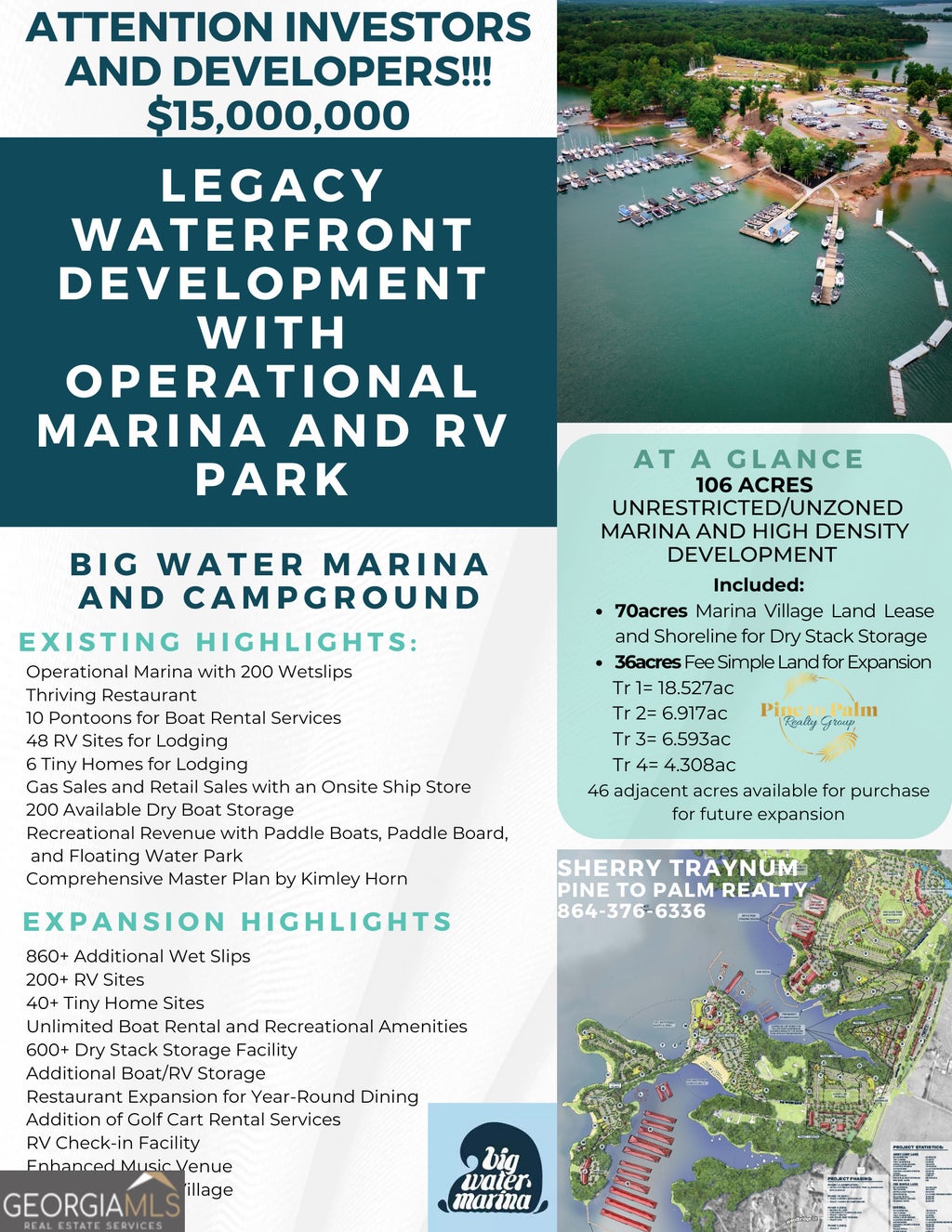 Introducing Big Water Marina and 106-acre Lakeside Resort Destination Development: your exclusive invitation to a 106-acre utopia nestled along the serene shores of Lake Hartwell. Prepare to be captivated by a world where opulence meets opportunity at every juncture. Step into a realm of unparalleled luxury and boundless potential. Big Water Marina isn't just a destination-it's a sanctuary of indulgence and promise. From its thriving marina and relaxing dining experiences to the snug embrace of its campgrounds and whimsical tiny home village, every facet radiates with possibility. But this is only the beginning of your adventure. Envision yourself as the visionary behind this waterfront masterpiece, not confined to the 70-acre lease of the marina but with the tantalizing prospect of expanding across an additional 36 acres along Big Water Rd and Hwy 29S. Here, your imagination knows no bounds, whether you dream of crafting an exclusive resort, a bespoke residential enclave, or a bustling commercial epicenter. Big Water Marina is more than just a property-it's a dynamic engine of revenue streams, ripe for expansion at every level. From 200 slip rentals to captivating boat charters, from cozy RV sites to enchanting tiny cottages, every corner brims with untapped potential. And with the added convenience of gas pumps, a boutique retail haven, and ample boat storage, your guests' every desire is catered to with effortless grace. Yet amidst this thriving hub of activity lies a hidden treasure: Florida Island, a pristine sanctuary encompassing 30 acres within the marina lease. Here, the canvas of possibilities stretches as far as the eye can see. Whether you envision expanding with additional RV sites, curating an intimate boutique hotel retreat, or preserving its natural splendor as a haven for all, the choice is yours to make. Beyond the gates of the marina lies a further 36 acres of promise, with the tantalizing option to acquire an additional 46 acres of lakefront property. This seamless transition into the heart of the action offers a gateway to unparalleled opportunity. Whether you seek to provide a welcoming portal to the marina or cultivate long-term lodging options, this parcel holds the key to unlocking Big Water Marina's full potential. This is more than just an investment-it's the birth of a legacy. As the proud steward of this slice of paradise, you'll not only cultivate generational wealth but also bask in the timeless allure of lakeside living. Welcome home-to a realm of endless possibilities, boundless beauty, and a lifetime of memories waiting to be forged.