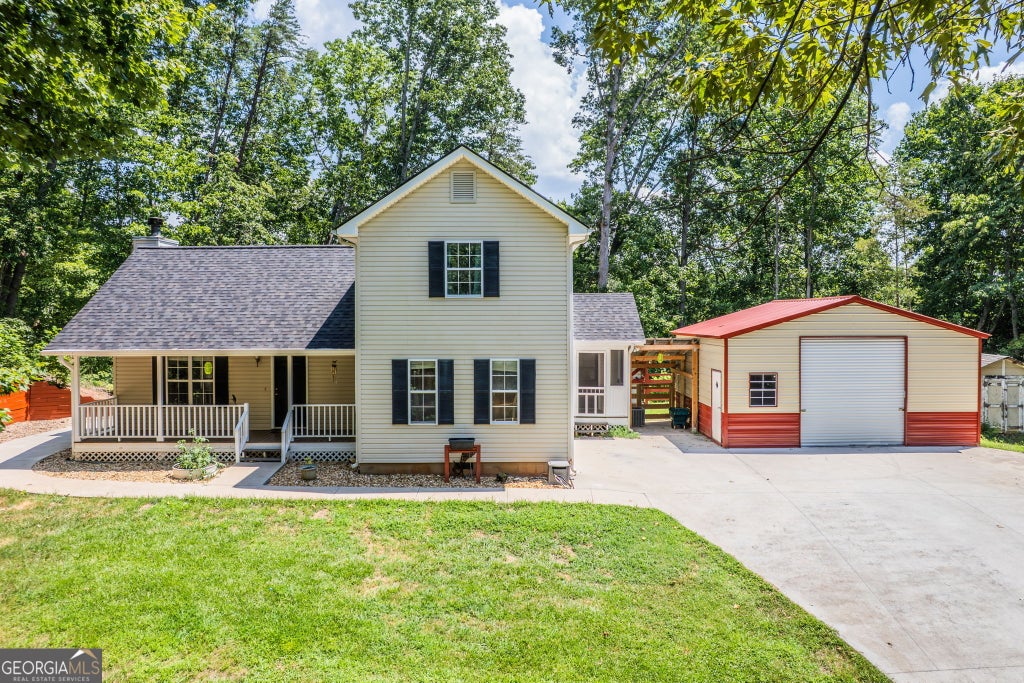 Welcome to this charming and private 3-bedroom, 2-bath home just 10 minutes from UNG Dahlonega and Lumpkin County High School. With the primary suite and laundry conveniently located on the main level, it's ideal for empty nesters or first-time homebuyers. This property is packed with exterior upgrades, including a brand new two-level workshop with upper storage and bay doors on both ends, a new driveway, shaded walkway, front fence, screened-in porch, side retaining wall, and covered gutters. A peaceful creek borders the back of the property, offering a serene natural setting. Inside, you'll find a custom mantel with built-in shelving, custom storage in the laundry room, newer appliances, almost new roof (2 years), and a recently serviced HVAC system. Move-in ready and full of thoughtful upgrades, this home offers the perfect balance of privacy and convenience.