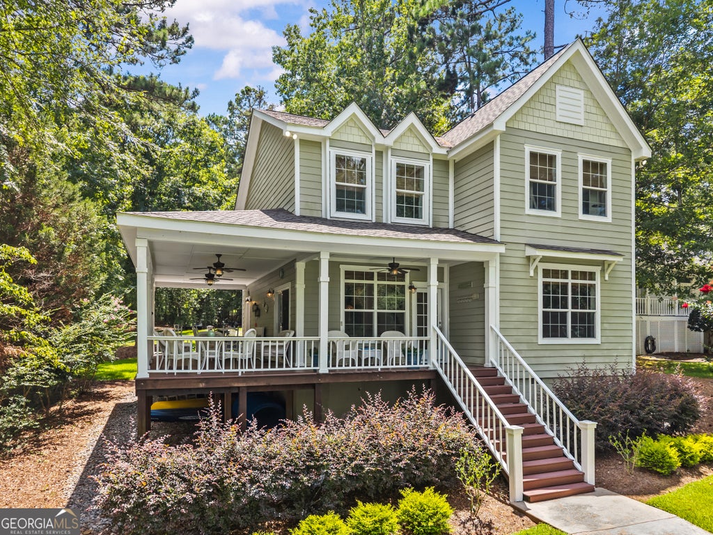 LAKE SINCLAIR PICTURE PERFECT HOME!! This is a charmer featuring an expansive wrap around porch! Perfect for those seeking tranquility, privacy and wide open water views on east Lake Sinclair where the water is known for clarity. This home is in turn key condition and completely updated. Tile and hardwoods throughout, stainless steel appliances, kitchen counter has quartz perimeter, butcher block accent island with designer pendant lights. Enjoy a well appointed coffee bar for those lake mornings. The living room features serene lake views, and electric fireplace with custom built-ins. Upstairs is a spacious primary suite, office nook and two guests bedrooms, one with bunk beds. The single stall boathouse is ready for your boat and the sun is shining! Time to jump in the lake!