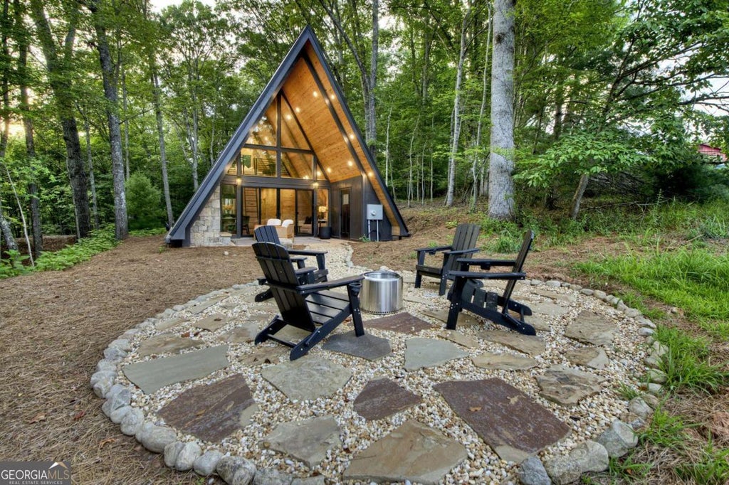 Tucked away in a serene, private setting just minutes from Downtown Blue Ridge, this striking modern-rustic A-frame offers an unparalleled mountain lifestyle. Framed by a lush rolling meadow and accented by soft short-range mountain views, this architectural gem is the epitome of luxury mountain living. Soaring floor-to-ceiling glass walls invite the outdoors in, filling the open-concept living space with natural light and showcasing the beauty of the surrounding landscape. The great room features a seamless flow between the living area, dining space, and a fully equipped kitchen-perfect for entertaining or unwinding fireside after a day of adventure. With one bedroom and a full bath on the main level, and a second picturesque bedroom loft above, the home is fully furnished and turnkey-ready-ideal for a high-performing short-term rental or a private mountain escape. Step out onto the covered back porch with a gas fireplace for cozy evenings under the stars, or follow the charming pebbled path to your own fire pit nestled in nature's embrace. Home is wired and ready for a hot tub. For the visionary, there is room on the property for a garage, guest house, or additional dwelling to complement the creation completed new. Find yourself immersed in the stars while positioned in your own private North Georgia meadow. A rare offering at an exceptional value, this A-frame retreat is your gateway to the tranquil luxury of North Georgia mountain living. **Rental estimates of $60-70k annually.** Inquire for more information!