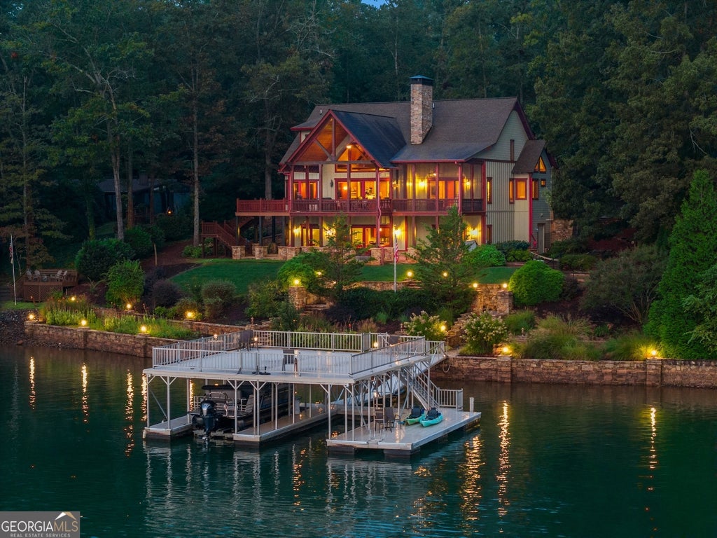 One of Lake Chatuge's Finest with all the features that make a Great Lake Home. Deep Water, Expansive Mountain Views, Large Dock, Amazing Home. Discover lakefront living at its finest in this 5 bedroom, 5.5 bath custom Timberlake-built home on the pristine deep waters of Lake Chatuge, The Home offers breathtaking views of both the lake and Mountains. This masterpiece combines timeless craftsmanship, elegant design, and every luxury you could ask for in a Lake Home. Main Level Features: Spectacular Great Room with soaring ceilings, a dramatic stone fireplace, and massive windows framing unforgettable lake views Gourmet Kitchen with premium finishes, high-end appliances, and a seamless flow into the dining area overlooking the lake Stunning Master Suite with lake views, a private screened porch, spa-style bath, and walk-in closet Dedicated office and laundry/mud room Attached 2-car garage for easy access Upstairs Retreat: Private ensuite bedroom with full bath Additional bedroom and bath Loft area perfect for a lounge, library, or flex space Generous storage options throughout Terrace Level Entertaining: Two additional ensuite bedrooms with full baths Kitchenette/wet bar with refrigerator for hosting with ease Cozy den with a stone fireplace Workshop in Basement and plenty of organized storage Outdoor Paradise: Terraced stone walls & patios create multiple levels of outdoor enjoyment Expansive cathedral-covered screened porch and large open decks totaling thousands of sq. ft. of outdoor living space - all with incredible lake and mountain views Mature landscaping & irrigated yard to enhance the natural beauty of the lot Top-of-the-line aluminum Double Slip covered dock with swim platform & party deck on year-round deep water This home truly has it all: quality construction, abundant features, smart design, year-round water, and one of the best lakefront neighborhoods on Lake Chatuge. Home Comes Fully Furnished and includes Dock and Boatlift.