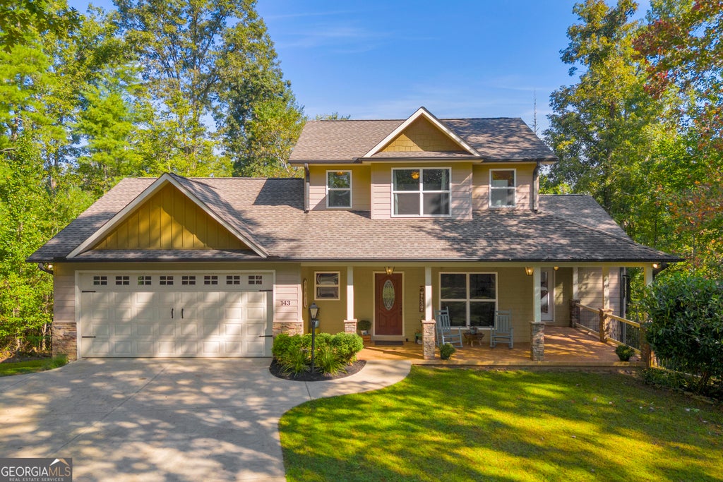 Enjoy the best of both worlds-seasonal mountain views and serene creek frontage! This custom-built craftsman style 4BR/3BA home offers privacy while still being conveniently close to schools, shopping, and everyday amenities. From the moment you arrive, you'll be welcomed by its great curb appeal, beautifully landscaped 1.97-acre setting, and inviting outdoor spaces. Relax or entertain on the wraparound porch, covered back porch, grilling deck, covered patio (perfect for a hot tub), fenced yard, or cozy fire pit. Inside, the main floor features an open layout with hardwood floors, a stone fireplace with built-ins, and a custom kitchen with abundant storage, solid-surface countertops, and stainless-steel appliances. The owner's suite-with private bath and access to the covered porch-plus a second bedroom are also on the main level, along with a large 2-car garage. Upstairs, you'll find two spacious bedrooms, each with walk-in closets, and a full bath. The full unfinished basement, with plenty of natural light and stubbed for an additional bath, offers endless possibilities for expansion. A private trail winds through the property leading to Tesnatee Creek, where you can enjoy nature at its best. Hot tub and furnishings are negotiable-making this home move-in ready and full of opportunity! New roof in 2018 and New HVAC in 2020
