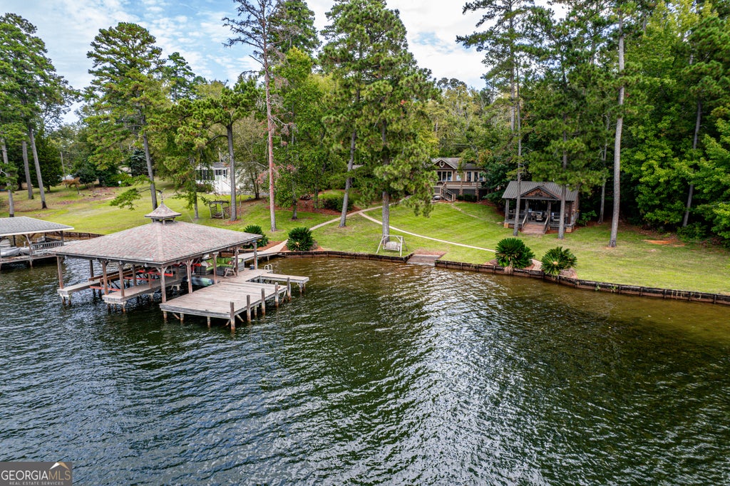 Stunning one-level lakefront home on a beautiful private 1.37-acre lot on Lake Sinclair with renovations completed in 2014 that doubled the size of the home. Featuring 5 bedrooms plus a bonus room that could be used for storage or as an additional bedroom. There are 4 full bathrooms with two of the bathrooms as ensuites. Gorgeous pine vaulted ceilings are featured in the dining room and main primary bedroom with pine beam ceilings in three of the secondary bedrooms. The spacious layout is perfect for family and guests. The open living and dining area offers 10-foot ceilings, a stone fireplace, and floor-to-ceiling windows with sweeping lake views. Floor to ceiling built in bookcases in the living room and one primary bedroom. The kitchen includes a 9-foot island and a walk-in pantry for all of your family gatherings. Enjoy outdoor living with a screened porch, an open deck with beautiful lake views of deep, clear water. The is a max dock with two boat slips with electric lifts and a dedicated space for jet skis. The water is 7-8 feet at the end of the dock with good water clarity. With 216 feet of waterfront, this property delivers the best of Lake Sinclair living. A cornerstone feature is a stunning 18x24 pavilion with metal roof built from 12x12 posts and beams from the Terminal Station in Macon. It is fully equipped for entertainment with a sink with running water, a wood burning fireplace, TV, grill, smoker, stone countertops, two small refrigerators, and plenty of storage.