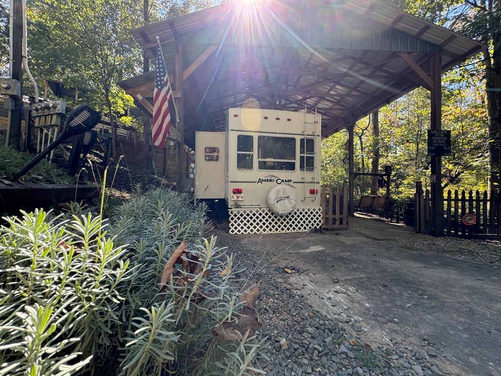Entertaining all reasonable offers! Great mountain getaway in Coosawatee River Resort near the picturesque town of Ellijay GA. Not only does this RV boast a 20 x 36 covering, but it's located near a little stream and is in an idyllic setting where you'll enjoy watching seeing deer daily and hearing the symphony of several different types of birds to delight you. Lots of outdoor living space with the picnic area for meals al fresco, and room to spread out under the generous covered entertainment space. High speed fiber internet is perfect for working from home. With the modest HOA fees, enjoy the indoor pool year-round, fitness center, game room, pickleball, tennis, tubing and kayaking all summer, two outdoor pools for catching some rays and a very large nearby riverfront park and dog parks for more fun. Nearby apple houses, vineyards, hiking, mountain biking, kayaking and more await to make Ellijay your full time, part-time home. STRs are allowed in this community. City water is billed by subdivision. Great storage building for all the things! Furnished and ready for new owners.