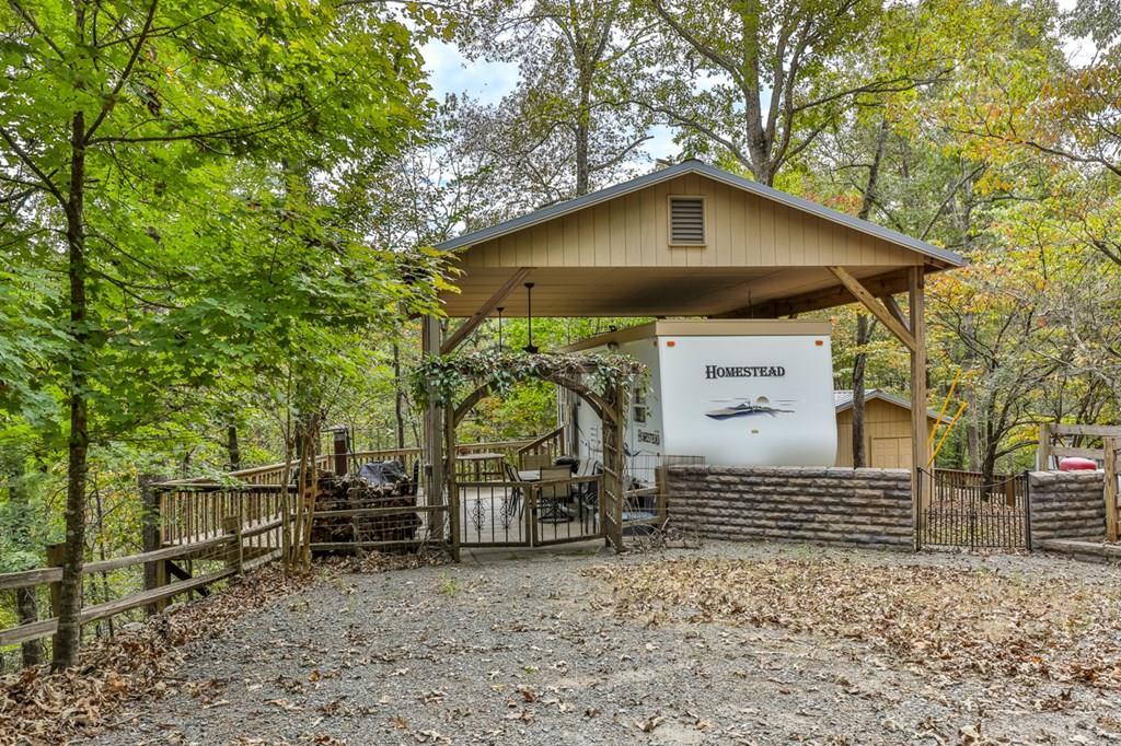 This 2015/16 30 ft Homestead Starcraft Camper has been lovingly cared for and immaculately kept. The camper is underpinned with metal and thermostatically controlled heat lamps. the roof has a frame, insulation and is rubber sealed for waterproofing. The camper is protected by a huge custom roof-over creating a lovely large porch complete with ceiling fans and lights and adjoins an expansive open deck. Lighted steps behind the camper links the porch with a custom-built 12x12 specially reinforced storage building which has its own 5KW heater to prevent freezing and houses a full sized refrigerator and a 40 gallon Rheem water heater which is piped underground into the camper. Both the roof-over and the storage building are guttered with screens and downspouts. The original 50 amp electric service was replaced with 200 amp service for 240 volts. The two camper lots are platted together to reduce the dues owed each year to the Property Owners Assoc. There is plenty of parking and turn around space for guests and the second lot has a small deck on it and could be set up for a great picnic area or outdoor space for a nice firepit !