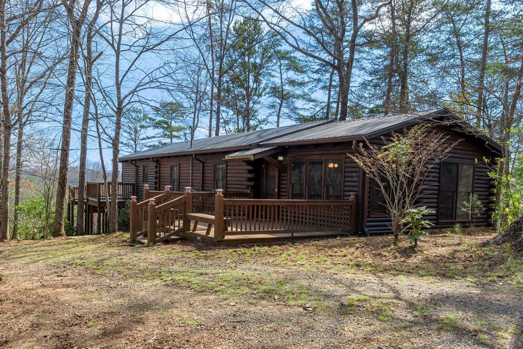 This charming 3-bedroom, 2-bathroom ranch log cabin has been cherished for many years, serving as the heart of countless memories. Situated on just over 4 acres, a rarity in this area, this property offers both space and tranquility. With an open-concept kitchen and dining area, you'll enjoy sweeping mountain views right from your kitchen and dining room windows, creating the perfect backdrop for any meal. The spacious, extended living area with a cozy wood-burning fireplace offers a warm and inviting atmosphere, spilling out to a screened-in porch and back deck, where you can relax while taking in the breathtaking 90 mountain views. The cabin also boasts a charming window seat between the kitchen and living room, providing a peaceful spot to unwind. Additional features include a cozy fire pit, a patio for outdoor entertaining, and convenient bonus storage underneath the deck. Fully furnished and move-in ready, this home offers the perfect blend of comfort and scenic beauty, just moments from the North Carolina line, Mineral Bluff and downtown Blue Ridge.