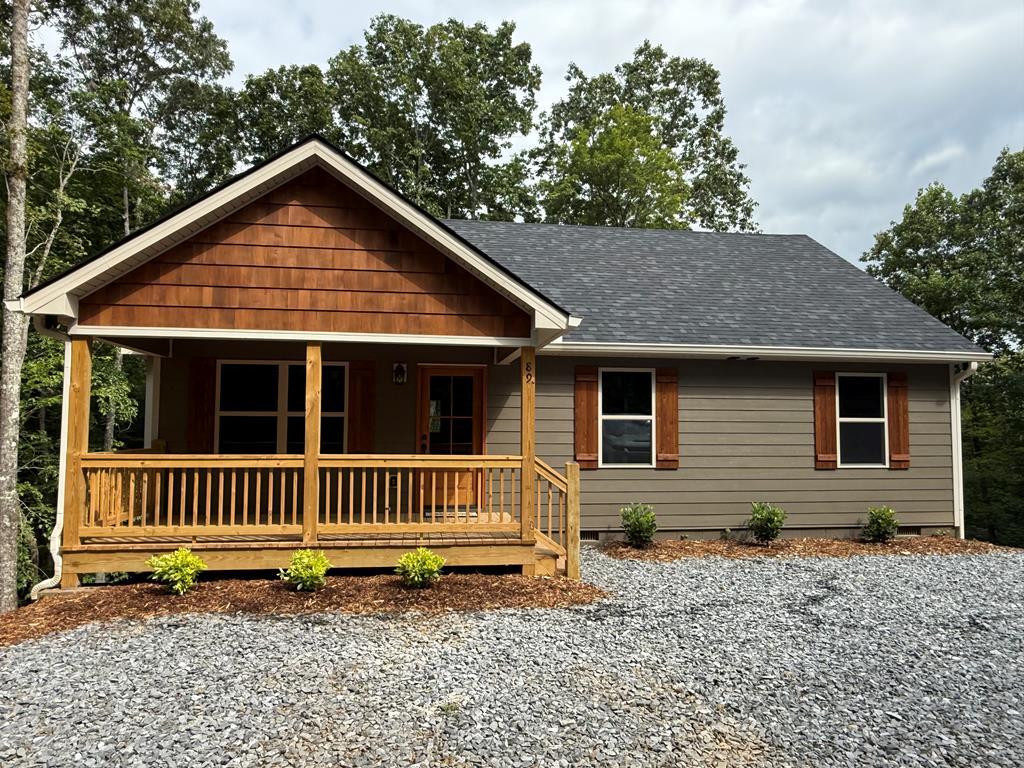 Here we have a recently completed new contruction just inside the Legion Rd gate of Coosawattee. On the outside you'll see the perfect visual combination of harde siding, wood and cedar shakes. Once you walk inside the first thing you'll see is the wood ceilings with beams and a floor to ceiling rock faced fireplace. The kitchen has a walk in pantry and a large eat-at island to compliment the granite counters and you'll notice all interior doors are solid wood, not hollow core. In the hallway there's a secondary bathroom for family and guests along with a linen closet. The master bedroom is large enough for a king sized bed and is conveniently prewired for television. Every bedroom has ceiling fans and vaulted wood ceilings and walk in closets. The main level back porch is covered and the lower level porch is great for grilling or watching the wildlife. This home also has a nice seasonal view when the leaves are off and the parking area has plenty of space for gatherings. The level front yard and just a couple of steps also makes for easy access.