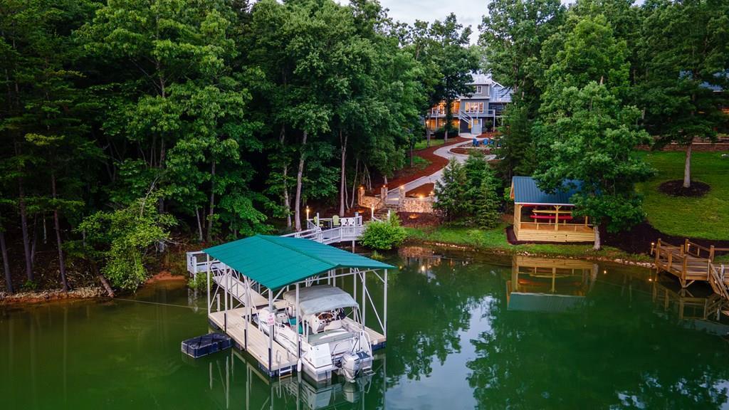 Welcome to the ultimate Lake Nottely retreat! A perfect match if your style is luxury and your vibe is laid-back lake life. Nestled in a peaceful cove with a private and permitted dock ready for your pontoon, this exceptional home is designed for making memories—whether you're boating all day or enjoying a glass of wine on the screened-in porch at sunset. Step inside to a warm, elegant interior featuring hardwood floors, oversized living spaces, and a true gourmet kitchen—complete with a Wolf 6-burner gas range, double ovens, custom cabinetry, granite island, additional prep space with sink, and a commercial-grade hood built for the serious home chef. The expansive primary suite is a haven, offering lake views, a large sitting area, and the primary bath boasts a garden tub, walk-in tile shower, and double vanity. Each bedroom has a private bath, and main and upper floor bedrooms all have walk-in closets, perfect for guests and family alike. The half bath is conveniently located on the main level. Entertainment and comfort are everywhere—from the custom bar with kegerator and game room with walk-out access to one of the multiple decks. The outdoor space is tailored for grilling, gathering, or just soaking up the mountain air. Should you need even more space, the finished room over the garage is well suited for extra sleeping quarters, hobby space, or storage. Outside, a colorful custom Compass Rose stamped into the concrete sets the tone of creativity and charm. Use the Gator to run firewood down to the lakeside fire pit or haul the tubes up after a day on the water. Storage is abundant with easy access and walk-in attic space as well as two full basement rooms, one perfect for a workshop. This home isn't just a house—it's a lifestyle for those who love to relax, entertain, and explore. Luxury, leisure, and lake life are calling. Come see what your next chapter could look like.