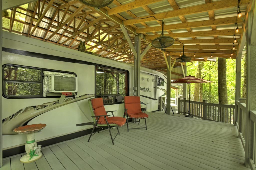 PRICED TO SELL!! Experience full time or part time Mountain Living in the sought after Coosawattee River Resort in this Turnkey 33ft Outback Keystone 5th wheel. Nestled among lush green space, this RV offers tons of privacy and natural beauty. R.V. Features four slide-outs for a roomy interior, enhanced by durable LVP flooring, an electric fireplace, surround sound, new kitchen faucet and abundant natural light.The bathroom has a walk-in shower and residential toilet for everyday ease. The bedroom offers a queen bed, a Large closet, and ample dresser space. A dedicated laundry area has also been added for functionality. Enjoy outdoor living, relaxing or grilling on the expansive covered composite deck (don't have to worry about replacing those rotted wood boards), protected by a Large roof-over with 3 ceiling fans. Newer large carport, bordered by a new 30-ft long retaining wall. Structural bracing and supports have been installed underneath the RV for added stability. A 9x12 storage shed provides extra space for tools, toys, or a man cave. Close to river, dog park and pool. Amenities such as river access, gated entrance, 3 pools (one indoor), tennis/basketball courts, mini golf, parks, pavilions, and walking trails. In the heart of wineries, eateries, antique stores, hiking/biking.