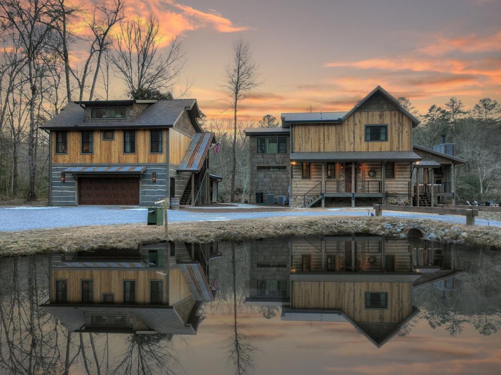 Welcome to the Toccoa Tailwater Fish Camp, a newly built 2024 lodge-style retreat offering over 300 feet of private Toccoa River frontage with a stocked pond on 4.04 acres. This one-of-a-kind property combines rustic craftsmanship with luxury finishes, designed for the ultimate fly-fishing and mountain lifestyle experience. The main lodge features 4 bedrooms, 3.5 baths, with 3 bedrooms facing the river, each with its own electric fireplace. Vaulted ceilings, cedar beams, chink-style siding, and designer fixtures enhance the warm lodge feel. Expansive windows frame river views while the chef's kitchen boasts granite countertops, custom cabinetry, and high-end appliances. The spacious party porch with a stone fireplace creates the perfect place to entertain while overlooking the river's natural rock shoals and waterfalls. The guest house, located above the 2-car garage, provides a private retreat with a living room, kitchen, 2 bedrooms joined by a bath, plus a loft for extra sleeping. A cozy covered porch with its own fireplace also faces the river, offering privacy and charm. Below, the custom speakeasy room is ideal for cocktails, games, or gatherings. Outdoors, a private stocked pond in the front yard is perfect for practicing your cast, while stone steps lead directly into the river to reach prime fishing holes. The gated entrance welcomes you into this fisherman's paradise, complete with thoughtful touches, true cedar log beams, and lodge-style details throughout. An additional buildable lot is included, featuring a 2-bedroom septic and power already in place—ideal for expansion or investment. Whether you're a serious angler, nature enthusiast, or seeking a luxury mountain escape, this property delivers an unmatched opportunity to own your private lodge on the Toccoa River.