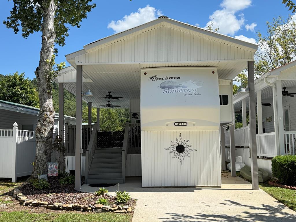 Charming Setting With Direct Pond & Mountain Views Nestled In The Enchanted Valley RV Resort. Discover peaceful living in this well-maintained 2003 model Coachmen Somerset Dreamcatcher Fifth-Wheel RV, featuring 1 bedroom and 1 bathroom. The RV has a kitchen, eat in dining area, living room, desk space and a full bathroom that connects to the bedroom. Complete with a roof-over and covered front porch. Perfect for relaxing while enjoying the tranquil views of the pond. This property is ideal for full-time living, weekend getaways, or a peaceful vacation retreat. The Enchanted Valley RV Resort offers the following community amenities, stocked pond access for catch and release fishing, river access, swimming pool, pavilion with a kitchen and shuffleboard. Plus a playground area for added outdoor fun. You'll have everything you need for recreation and relaxation right at your fingertips. Located just minutes to Downtown Hiawassee and Lake Chatuge!