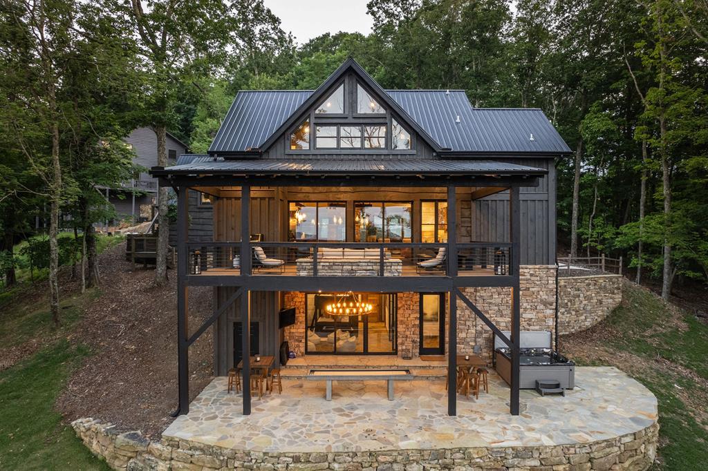 An ethereal mountain retreat -- welcome to Stags Manor! Overlooking panoramic layered mountain views, lush U.S. National Forestry land, and some of the best sunsets in the North Georgia Mountains! This rustic-contemporary blend chalet beckons luxurious mountain living with a gourmet kitchen, VIKING kitchen appliances, custom concrete countertops, custom stone masonry work, chef's kitchen eat-in island and large open-concept dining area, comfortable living room, and the focal point of the main level: a four-sided fireplace! Glass sliders open up to the most luxurious covered deck with a custom linear fire table, outdoor grilling area, comfortable seating, and views across the horizon. Main house is complete with an upstairs primary bedroom with in-room laundry, a large coffee/wine bar, office, and ample custom storage. Terrace level has a large bunk room, fireplace, large bathroom, and walk-out sliders to a large patio with a jacuzzi and gaming area. Two car finished garage has an additional full bedroom ensuite above with kitchenette. Fully-furnished with high-end furnishings and decor, minutes away from some of the area's most sought-after hiking and biking trails, the Toccoa River, Lake Blue Ridge -- the outdoor world is your oyster! Concrete driveway, designer lighting, and a finishes list that far exceeds the "mountain norm!" Whether a full-time, second home, or rental retreat, this unique and luxurious lodge won't last long. Call today for an exclusive tour.